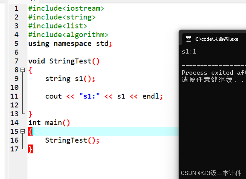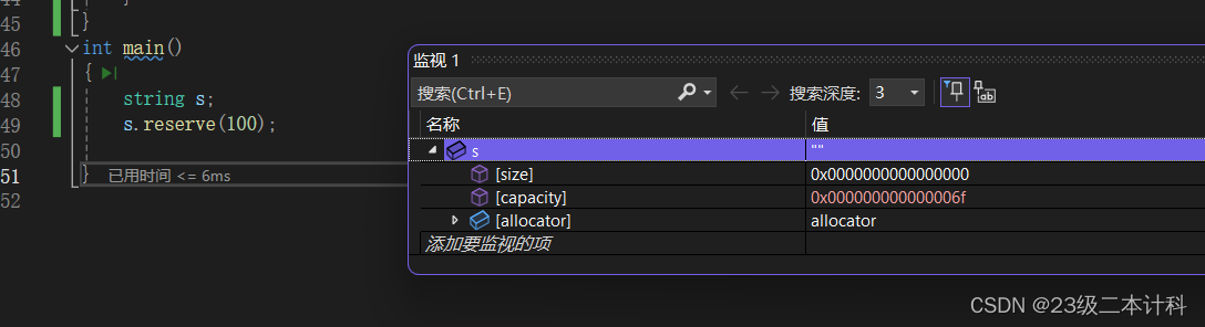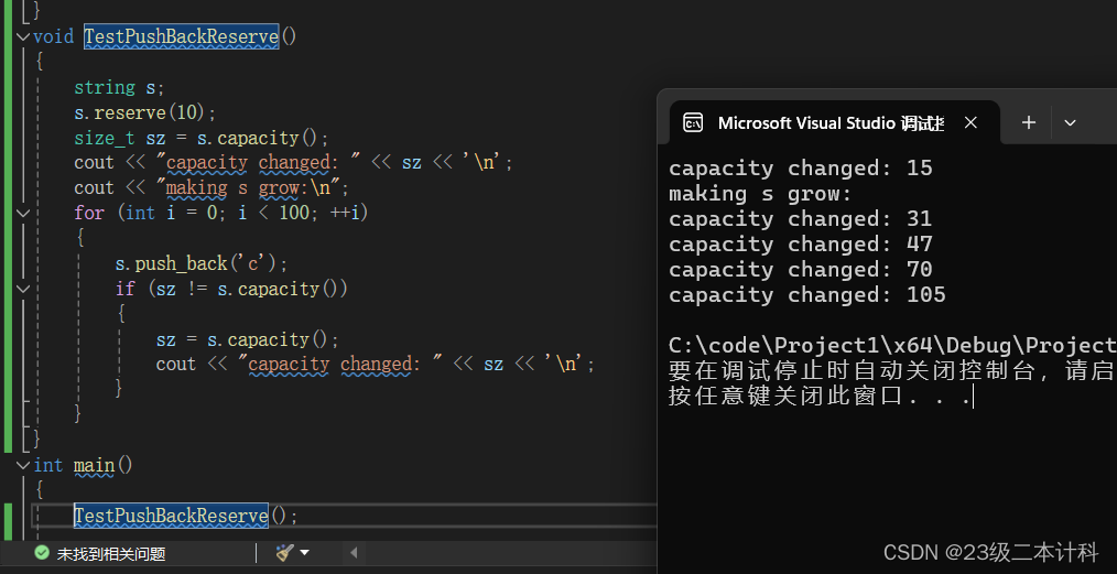 可以看到,s.reserse(10); 后capacity仍是15,因为string对象创建好之后,内部会有16个字符的空间,有一个空间存放/0。(如果capacity>15,s.reserse(10)会缩容到15)