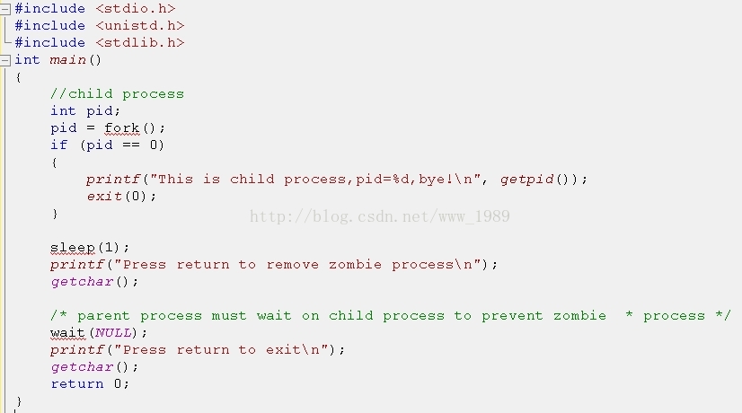 在用户第一次回车之前,通过ps命令,应该可以看到子进程是 defunct 状态 (也就是zombie态),而一旦按下回车,wait被调用,此时通过ps命令就无法看到那个zombie了。所以防止zombie process的方法就是通过wait/waitpid等调用来解决。