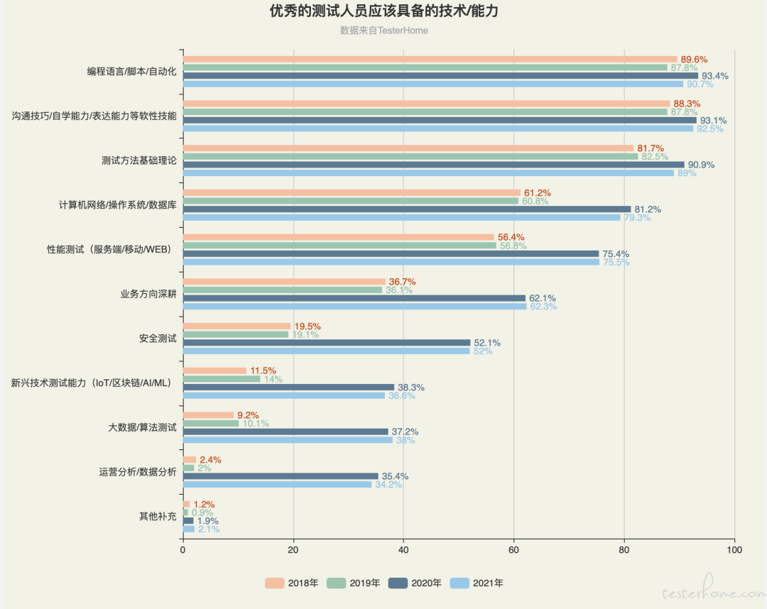 根据Testerhome《2021年度测试行业问卷调查报告》-【优秀测试人员应具备的技术/能力】分析