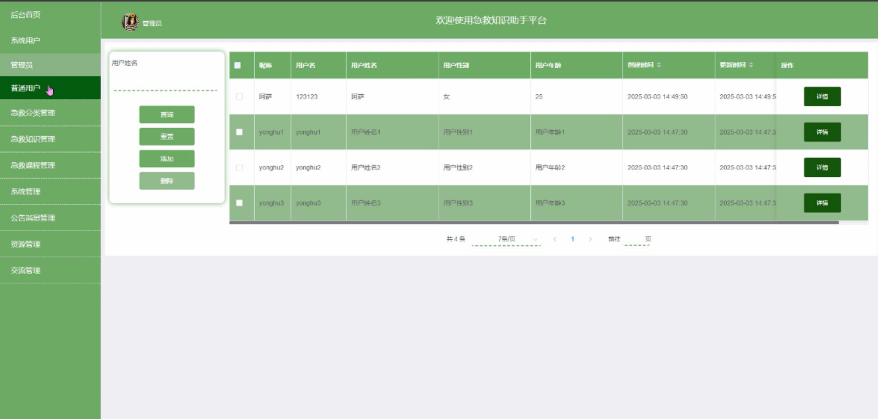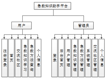 管理员可管理系统用户、急救分类管理、急救知识管理、急救课程管理、系统管理、公告消息管理、资源管理、交流管理等。