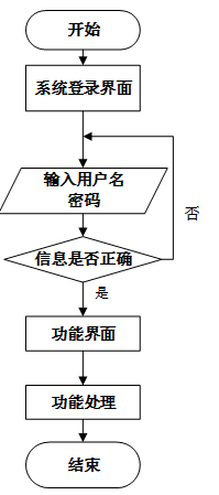 用户首先进入系统登录界面,输入用户名和密码后,系统验证信息是否正确。若验证失败,返回登录界面重新输入;若验证成功,则进入功能界面,执行相应功能处理后结束操作流程。操作流程如图3-5所示。