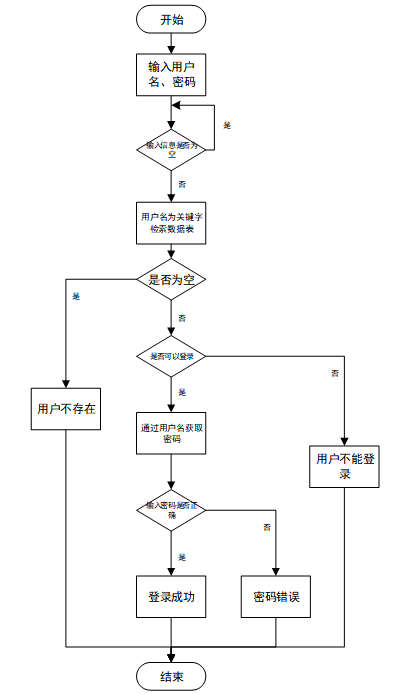 用户输入用户名和密码后,系统先检查输入是否为空,再验证用户名是否存在,若存在则通过用户名获取密码并校验。若密码正确则登录成功,否则提示密码错误。若用户名不存在或无法登录,提示用户操作无效。如图3-4所示。