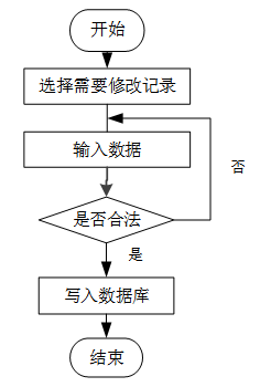 用户首先选择需要修改的记录,输入修改后的数据,系统判断输入数据是否合法。若数据不合法,提示重新输入;若数据合法,则将修改后的数据写入数据库,完成操作后流程结束。修改信息流程图如图3-7所示。