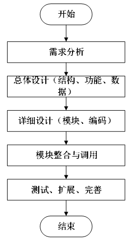 系统开发流程的主要步骤,从需求分析到系统完成的全过程。流程包括需求分析、总体设计(结构、功能、数据)、详细设计(模块、编码)、模块整合与调用,以及测试、扩展和完善,最终完成系统的开发。本系统的开发流程如图3-3所示