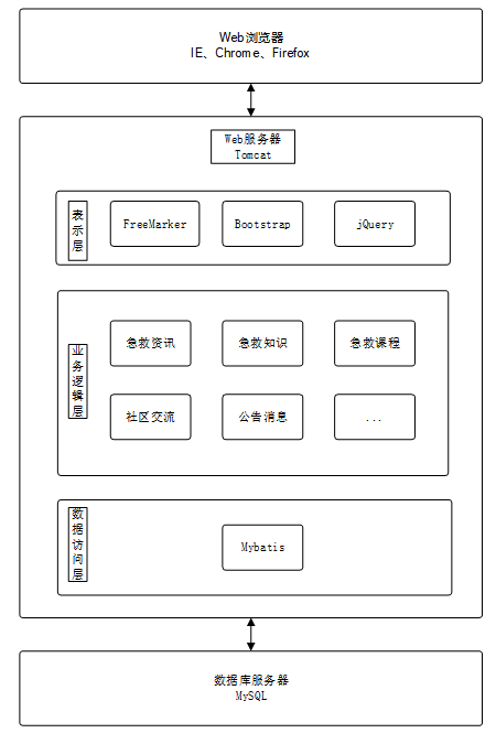 系统由表现层、业务逻辑层、数据访问层和数据库服务器组成。表现层通过浏览器(如IE、Chrome、Firefox)与用户交互,采用FreeMarker、Bootstrap、jQuery等技术实现界面呈现。业务逻辑层负责处理系统的核心业务逻辑,通过分模块设计实现功能分离。数据访问层使用MyBatis框架连接数据库,执行数据的增删改查操作。数据库服务器采用MySQL进行数据存储和管理,为系统提供稳定的数据库支持。整个架构通过Tomcat服务器完成用户请求的接收和处理,确保系统的高效运行[8]。整个系统架构如图4-1所示。