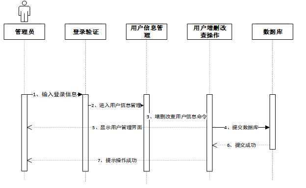 管理员输入登录信息后,进入用户信息管理模块,选择增删改查操作并提交命令至数据库。数据库执行操作后返回成功状态,系统显示用户管理界面并提示操作成功。管理员修改用户信息时序图如图4-5所示。