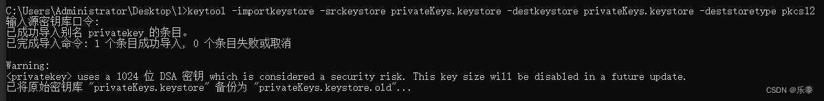 4.1警告: PKCS12 密钥库不支持其他存储和密钥口令。正在忽略用户指定的-keypass值。