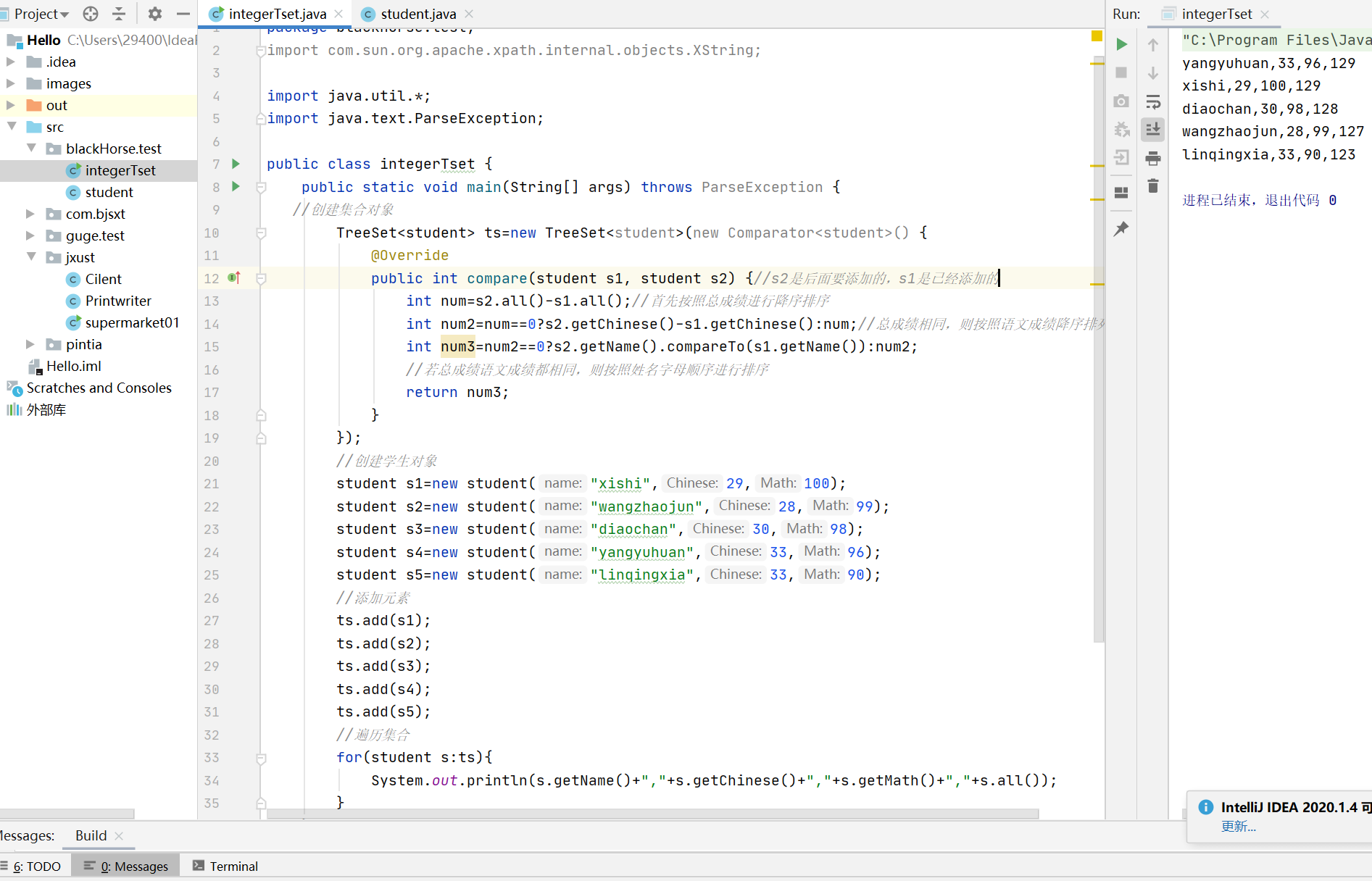 当我把compareTo的return值改成1之后,就能将所有的数据保存在集合里面了,遍历时是正序输出(遍历输出顺序与存储输入的顺序一致)