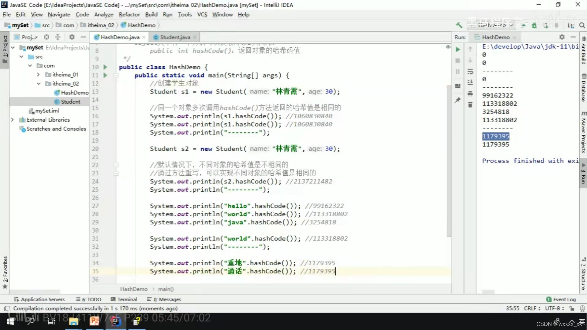 重写后的运行结果(注释后面写的是未重写hashCode()方法的运行结果)