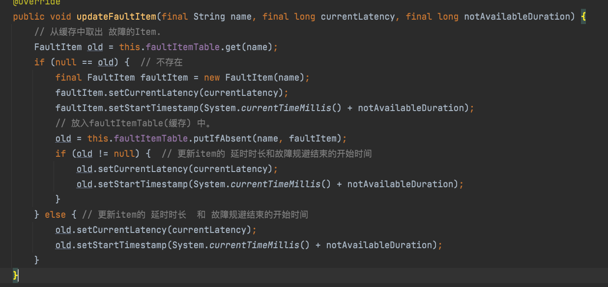 图中对代码进行注释,不过多解释了。其中 FaultItem 是 存储故障broker的类,可以称为 失败条目,每个FaultItem 存储了broker的名称,消息发送延迟的时长,故障规避结束的开始时间。