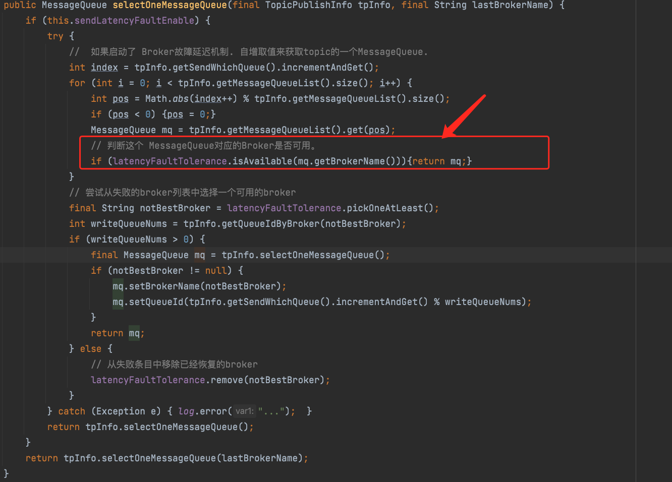 sendLatencyFaultEnable 是什么意思呢? 它表示是否启用 Broker故障延迟机制。 看下图中的代码,我们假设 启用了 Broker故障延迟机制。