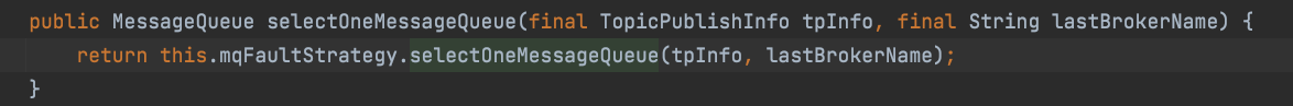 先不急着解决,我们看一下消息第一次发送是怎样的过程。 图中2处,会根据 topicPublishInfo 取出一个MessageQueue。 跟进代码: