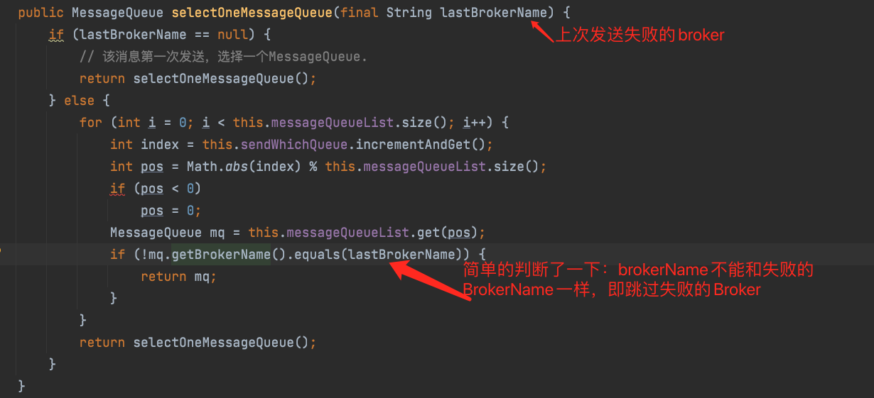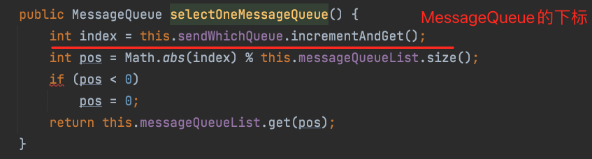 最后就是根据 selectOneMessage() 方法通过轮询的方式来选MessageQueue了。第一次是通过随机的方式来选出第一个 MessageQueue的,重试的都是 轮询的去取了。