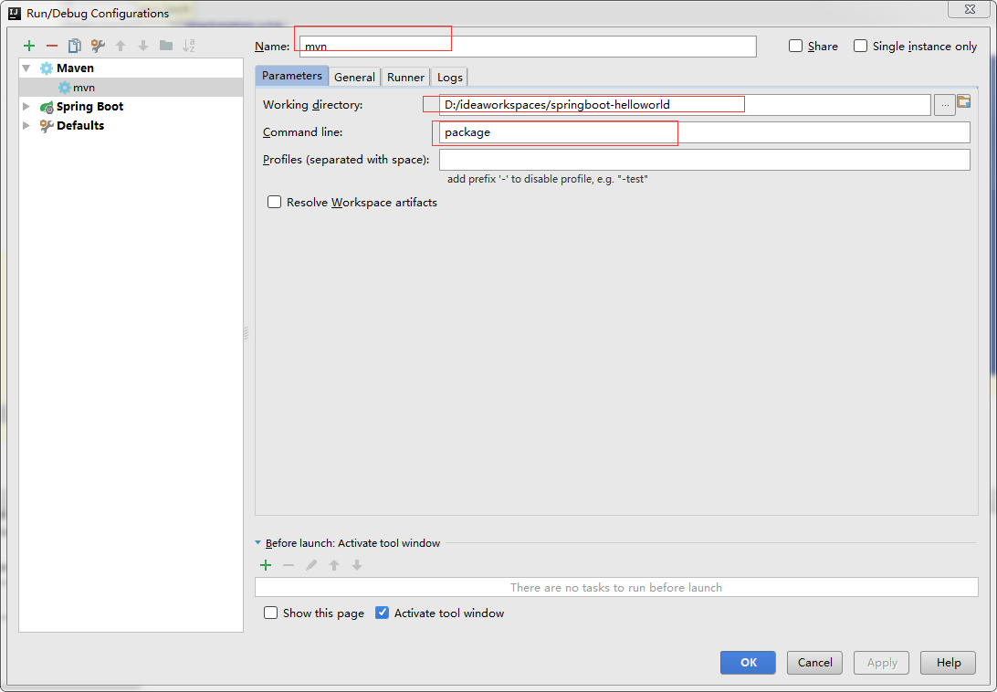 打开Run/Debug Configurations对话框添加一个Maven打包配置,如图