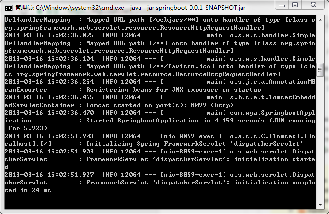 打开cmd,到jar 包所在目录 运行命令 java -jar springboot-0.0.1-SNAPSHOT.jar