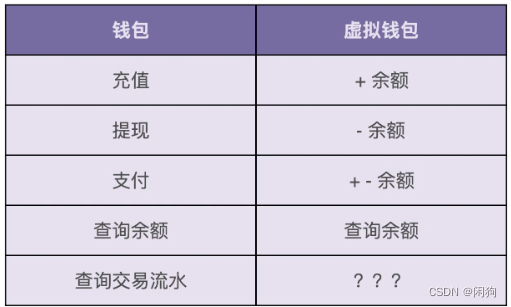 每个用户开设一个系统内的虚拟钱包账户,支持用户充值、提现、支付、冻结、透支、转赠、查询账户余额、查询交易流水等操作。