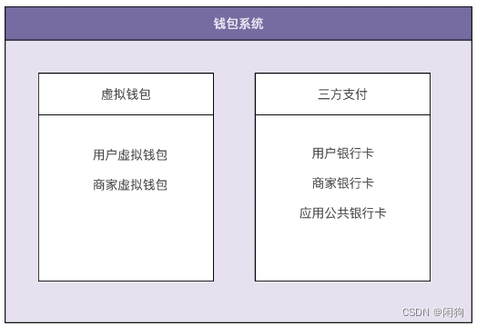 整个钱包系统的业务划分为两部分,其中一部分单纯跟应用内的虚拟钱包账户打交道,另一部分单纯跟银行账户打交道。基于这样一个业务划分,给系统解耦,将整个钱包系统拆分为两个子系统:虚拟钱包系统和三方支付系统。
