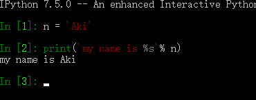 这段代码首先定义了一个名为n的变量,内容为Aki。然后下方的字符串中有一个%s,他的含义是“这里将被替换成一个新的字符串”,用作替换的内容放在字符串后面的%后面,就是那个n。所以最终这个字符串会变成My name is Aki。