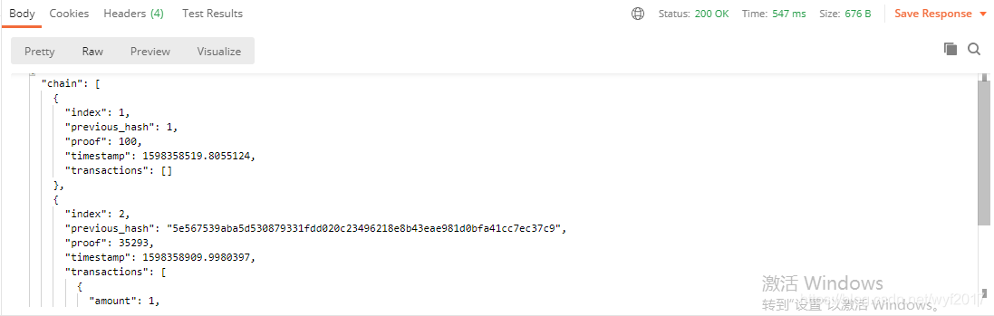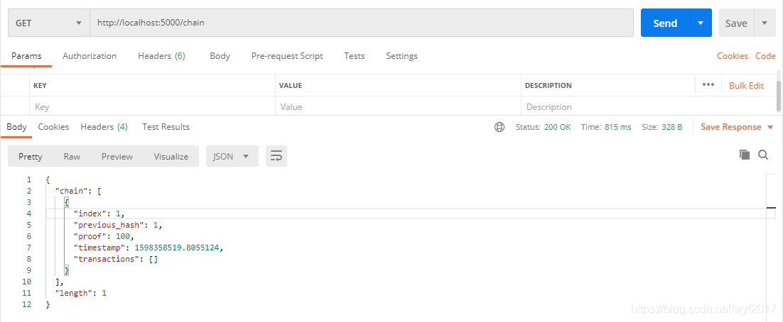 然后打开我们的Postman软件,在里面输入:http://localhost:5000/chain