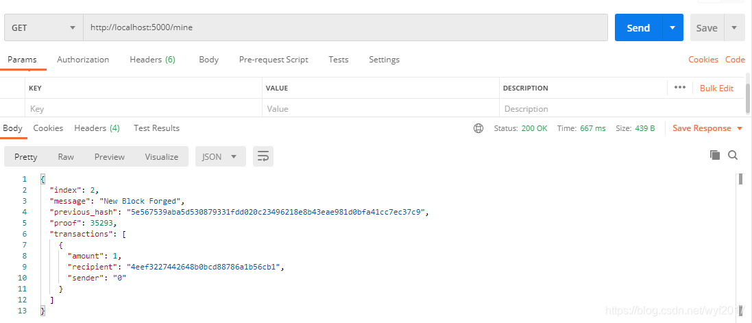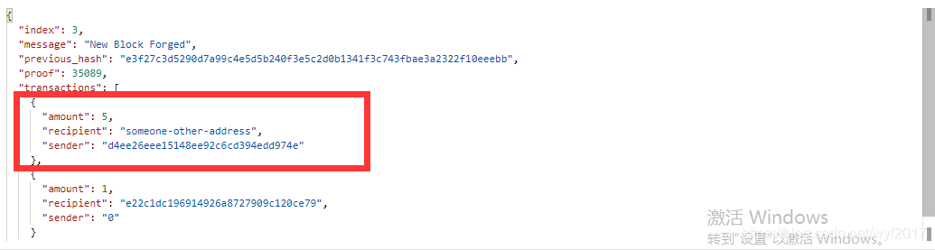 这时候我们来创建一个区块,在里面输入:http://localhost:5000/mine