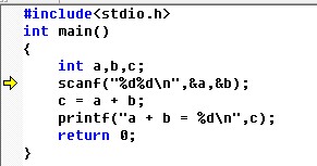 再按下F10后,程序来到了输入语句scanf这里,如下图: