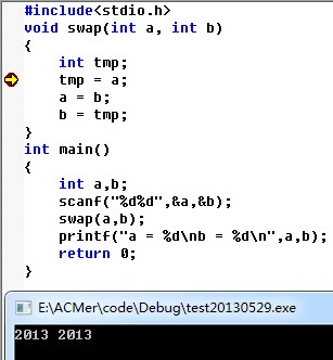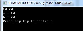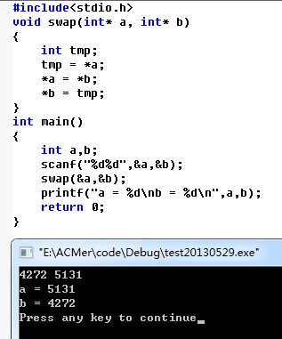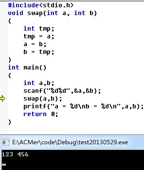 #include<stdio.h> void swap(int a, int b) { int tmp; tmp = a; a = b; b = tmp; } int main() { int a,b; scanf("%d%d",&a,&b); swap(a,b); printf("a = %d\nb = %d\n",a,b); return 0; }程序想法很简单,输入两个数,交换后输出。