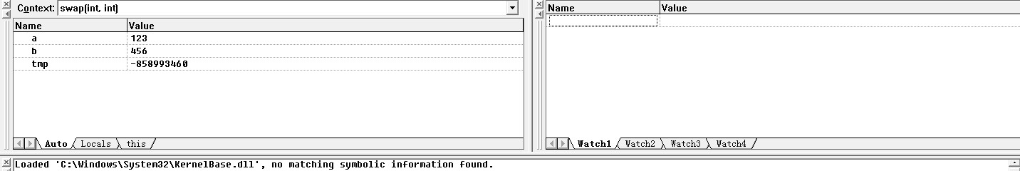 左边的是VC自动提供的课显示一个最近改变的变量的窗口,右边的即是Watch,我们可以在Name这一栏填入我们自己需要跟踪的变量,这里填入变量a、b和tmp,如图: