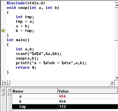 方法一:运用断点(F9)。我们将光标定位在swap函数里的第一条语句 tmp = a;然后按下F9,此时该行前面会有一个小红圈,这时断点设置成功(将光标移到断点处再按一次F9即可取消断点)。如图:![]()