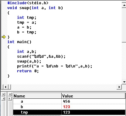 我们使用F10调试命令,swap函数返回前的执行过程(注意,a,b变量属于swap函数)如下图: