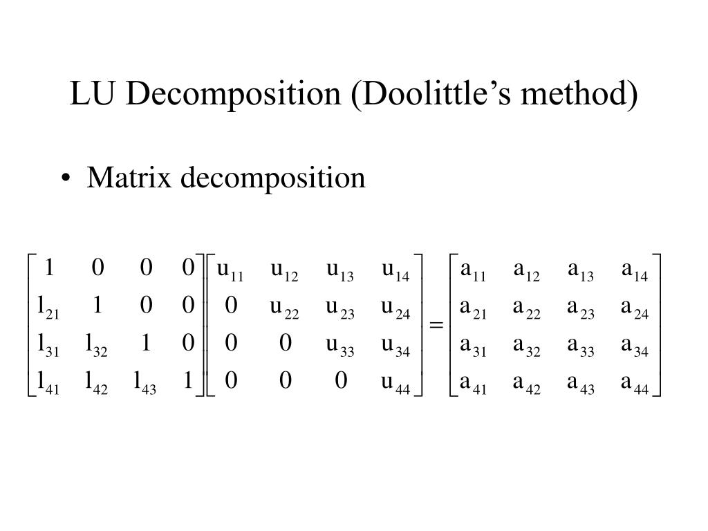 Doolittle方法(即LU分解)及Python实现 目录一、LU分解原理二、LU分解过程三、Python实现完整代码四、矩阵的一些补充概念一、LU分解原理1.Gauss elimination takes more computational time for higher-order matrices. To reduce time consumption a matrix can be decomposed using LU factoring methods.A system of linear equation