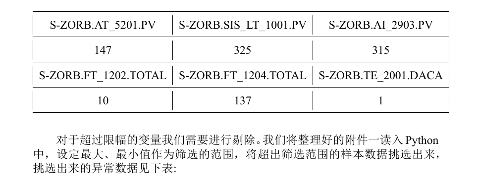 对于超过限幅的变量我们需要进行剔除。我们将整理好的附件一读入Python中,设定最大、最小值作为筛选的范围,将超出筛选范围的样本数据挑选出来,挑选出来的异常数据见下表: