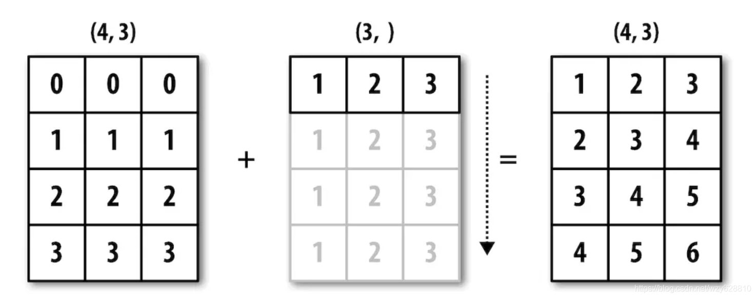 - 一维数组在列方向(axis=0)进行广播变为二维数组: