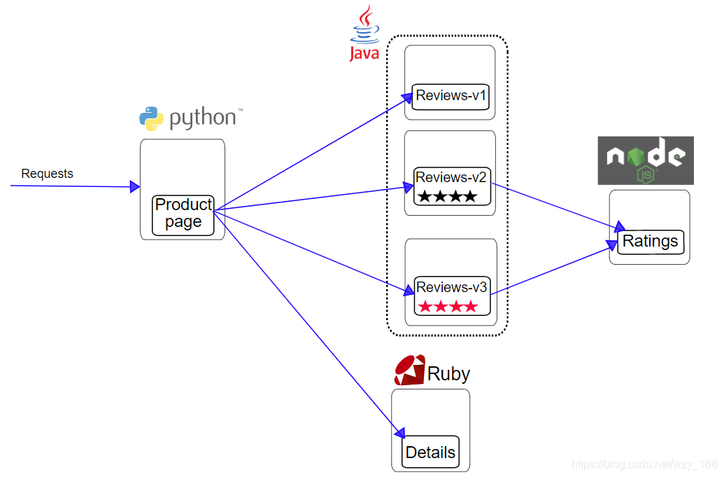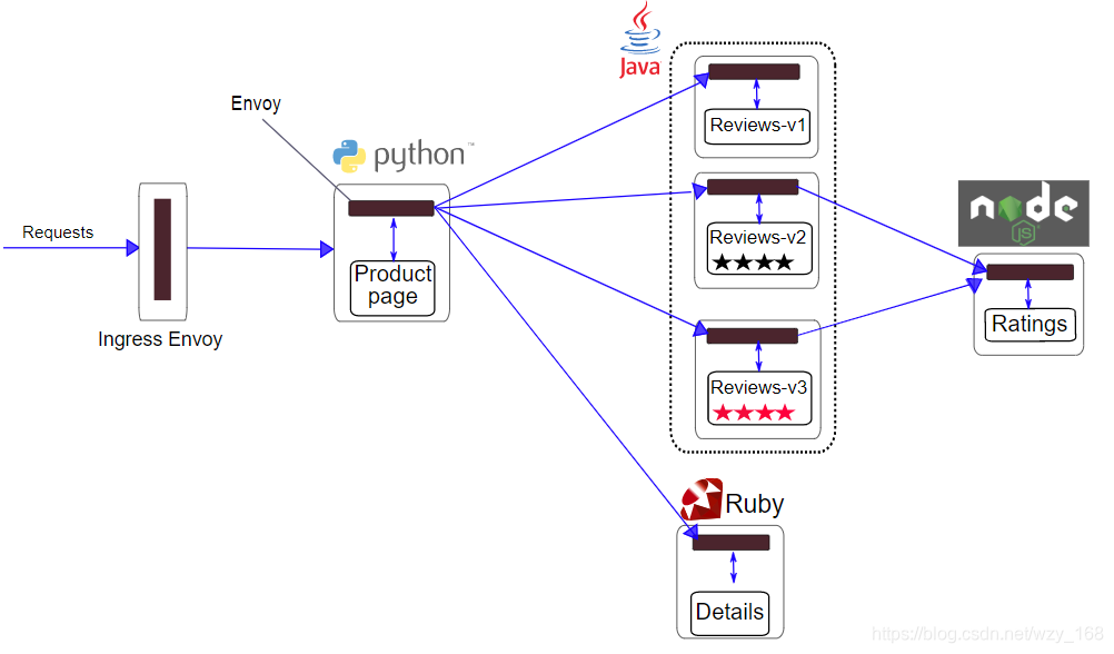 ratings服务,并将每个等级显示为1到5个红色星号★。BookInfo架构图: