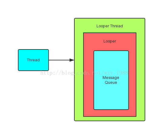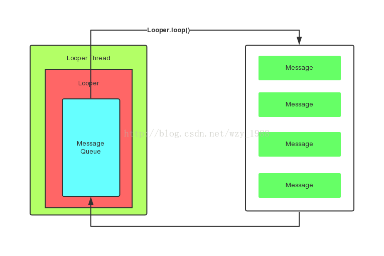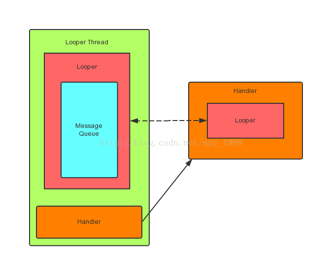 这解决了Android经典的不能在非主线程中更新UI的问题。Android的主线程也是一个Looper线程,我们在其中创建的Handler将默认关联主线程Looper的消息队列。因此,我们可以在主线程创建Handler对象,在耗时的子线程获取UI信息后,通过主线程的Handler对象引用来发生消息给主线程,通知修改UI,当然消息了还可以包含具体的UI数据。