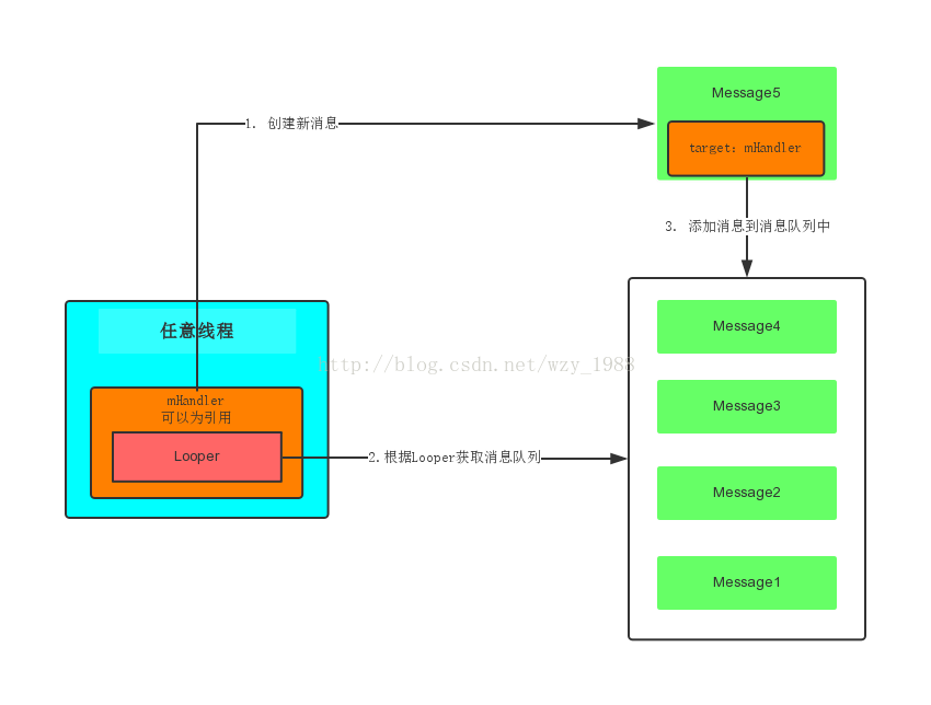 1. handler可以在任意线程上发送消息,这些消息会被添加到Handler所属线程的Looper对象的消息队列里。