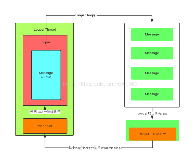 - 如果上述都没有,该消息会被交给Handler子类实现的handlerMessage(Message msg)来处理。当然,这需要从Handler派生并重写HandlerMessage函数。