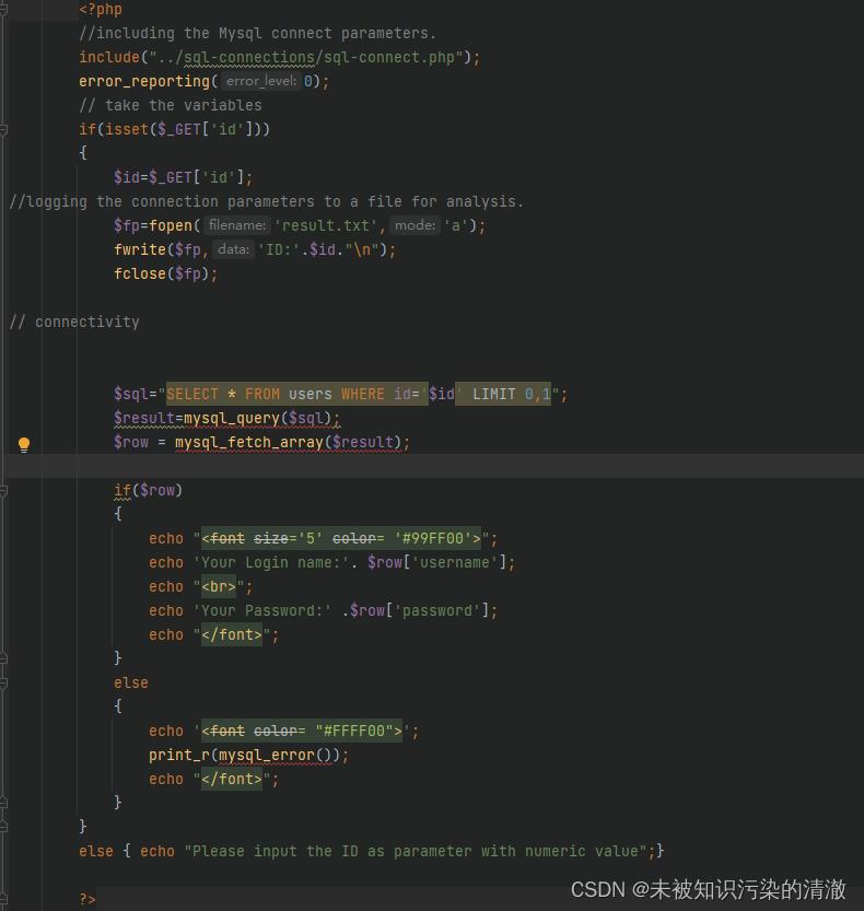 SQLI-LABS第二关代码审计及防御加固 这里将前端传入的id参数与sql语句进行拼接,在交互这里没有创建黑名单也没有进行参数化查询造成了一定隐患,防御和改进方法会在下文中提到,注释在图中。带段代码注释已经在图片,其作用是将我们输入的sql语句存入文件中方便运维人员对其查询,知道自己的数据库是否被人非法操作。可以使用preg_replace()函数,即使用正则表达式替换掉即将传入数据库字符中的 "" ''如果输入的数据是空则输出字段为空字样与开头的if(isset($_GET['id']))为一组相呼应。文件中是这关注入的所有代码。