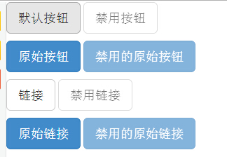 <!DOCTYPE html> <html> <head> <!-- 设置html中能显示中文 --> <meta http-equiv="Content-Type" content="text/html; charset=UTF-8"> <title>Bootstrap 实例 - 按钮禁用状态</title> <link rel="stylesheet" href="http://apps.bdimg.com/libs/bootstrap/3.3.0/css/bootstrap.min.css"> <script src="http://apps.bdimg.com/libs/jquery/2.1.1/jquery.min.js"></script> <script src="http://apps.bdimg.com/libs/bootstrap/3.3.0/js/bootstrap.min.js"></script> </head> <body> <p> <button type="button" class="btn btn-default btn-lg"> 默认按钮 </button> <button type="button" class="btn btn-default btn-lg" disabled="disabled"> 禁用按钮 </button> </p> <p> <button type="button" class="btn btn-primary btn-lg "> 原始按钮 </button> <button type="button" class="btn btn-primary btn-lg" disabled="disabled"> 禁用的原始按钮 </button> </p> <p> <a href="#" class="btn btn-default btn-lg" role="button"> 链接 </a> <a href="#" class="btn btn-default btn-lg disabled" role="button"> 禁用链接 </a> </p> <p> <a href="#" class="btn btn-primary btn-lg" role="button"> 原始链接 </a> <a href="#" class="btn btn-primary btn-lg disabled" role="button"> 禁用的原始链接 </a> </p> </body> </html>