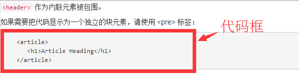 <!DOCTYPE html> <html> <head> <meta http-equiv="Content-Type" content="text/html; charset=UTF-8"> <title>Bootstrap 实例 - 代码</title> <link href="http://libs.baidu.com/bootstrap/3.0.3/css/bootstrap.min.css" rel="stylesheet"> <script src="http://libs.baidu.com/jquery/2.0.0/jquery.min.js"></script> <script src="http://libs.baidu.com/bootstrap/3.0.3/js/bootstrap.min.js"></script> </head> <body> <p><code><header></code> 作为内联元素被包围。</p> <p>如果需要把代码显示为一个独立的块元素,请使用 <pre> 标签:</p> <pre> <article> <h1>Article Heading</h1> </article> </pre> </body> </html>
