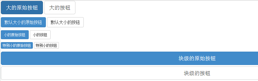 <!DOCTYPE html> <html> <head> <!-- 设置html中能显示中文 --> <meta http-equiv="Content-Type" content="text/html; charset=UTF-8"> <title>Bootstrap 实例 - 按钮大小</title> <link rel="stylesheet" href="http://apps.bdimg.com/libs/bootstrap/3.3.0/css/bootstrap.min.css"> <script src="http://apps.bdimg.com/libs/jquery/2.1.1/jquery.min.js"></script> <script src="http://apps.bdimg.com/libs/bootstrap/3.3.0/js/bootstrap.min.js"></script> </head> <body> <p> <button type="button" class="btn btn-primary btn-lg"> 大的原始按钮 </button> <button type="button" class="btn btn-default btn-lg"> 大的按钮 </button> </p> <p> <button type="button" class="btn btn-primary"> 默认大小的原始按钮 </button> <button type="button" class="btn btn-default"> 默认大小的按钮 </button> </p> <p> <button type="button" class="btn btn-primary btn-sm"> 小的原始按钮 </button> <button type="button" class="btn btn-default btn-sm"> 小的按钮 </button> </p> <p> <button type="button" class="btn btn-primary btn-xs"> 特别小的原始按钮 </button> <button type="button" class="btn btn-default btn-xs"> 特别小的按钮 </button> </p> <p> <button type="button" class="btn btn-primary btn-lg btn-block"> 块级的原始按钮 </button> <button type="button" class="btn btn-default btn-lg btn-block"> 块级的按钮 </button> </p> </body> </html>