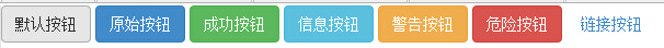 <!DOCTYPE html> <html> <head> <!-- 设置html中能显示中文 --> <meta http-equiv="Content-Type" content="text/html; charset=UTF-8"> <title>Bootstrap 实例 - 按钮选项</title> <link rel="stylesheet" href="http://apps.bdimg.com/libs/bootstrap/3.3.0/css/bootstrap.min.css"> <script src="http://apps.bdimg.com/libs/jquery/2.1.1/jquery.min.js"></script> <script src="http://apps.bdimg.com/libs/bootstrap/3.3.0/js/bootstrap.min.js"></script> </head> <body> <!-- 标准的按钮 --> <button type="button" class="btn btn-default">默认按钮</button> <!-- 提供额外的视觉效果,标识一组按钮中的原始动作 --> <button type="button" class="btn btn-primary">原始按钮</button> <!-- 表示一个成功的或积极的动作 --> <button type="button" class="btn btn-success">成功按钮</button> <!-- 信息警告消息的上下文按钮 --> <button type="button" class="btn btn-info">信息按钮</button> <!-- 表示应谨慎采取的动作 --> <button type="button" class="btn btn-warning">警告按钮</button> <!-- 表示一个危险的或潜在的负面动作 --> <button type="button" class="btn btn-danger">危险按钮</button> <!-- 并不强调是一个按钮,看起来像一个链接,但同时保持按钮的行为 --> <button type="button" class="btn btn-link">链接按钮</button> </body> </html>