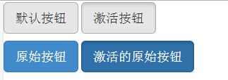 <!DOCTYPE html> <html> <head> <!-- 设置html中能显示中文 --> <meta http-equiv="Content-Type" content="text/html; charset=UTF-8"> <title>Bootstrap 实例 - 按钮激活状态</title> <link rel="stylesheet" href="http://apps.bdimg.com/libs/bootstrap/3.3.0/css/bootstrap.min.css"> <script src="http://apps.bdimg.com/libs/jquery/2.1.1/jquery.min.js"></script> <script src="http://apps.bdimg.com/libs/bootstrap/3.3.0/js/bootstrap.min.js"></script> </head> <body> <p> <button type="button" class="btn btn-default btn-lg "> 默认按钮 </button> <button type="button" class="btn btn-default btn-lg active"> 激活按钮 </button> </p> <p> <button type="button" class="btn btn-primary btn-lg "> 原始按钮 </button> <button type="button" class="btn btn-primary btn-lg active"> 激活的原始按钮 </button> </p> </body> </html>