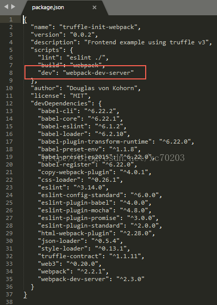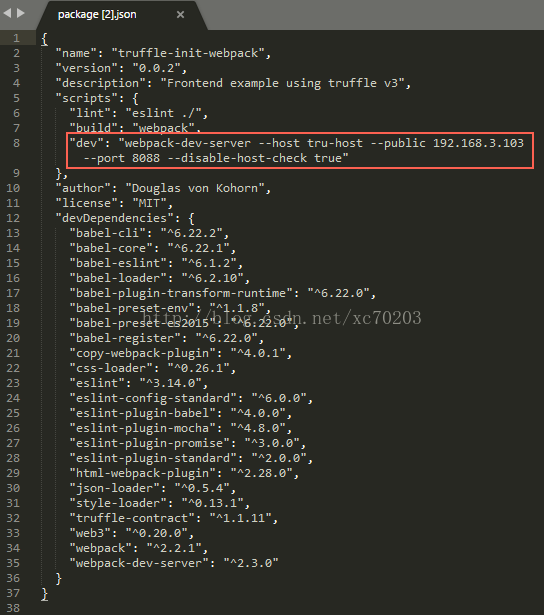 回到项目目录,编辑package.json,将scriptes/dev的值修改为:"webpack-dev-server --host tru-host --public 192.168.3.103 --port 8088 --disable-host-check true",如下图: