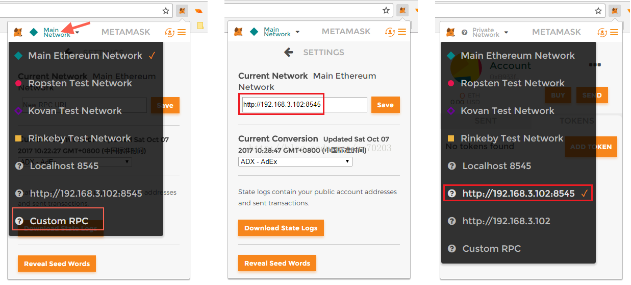 在登录的状态下点击下这个插件,左上角可以看到网络切换,选择”Custom RPC“并填入之前eth-host主机的IP地址和端口(http://192.168.3.102:8545),点击”save“保存eth网络设置;回到网络选择页面,选择刚才配置的eth网络。
