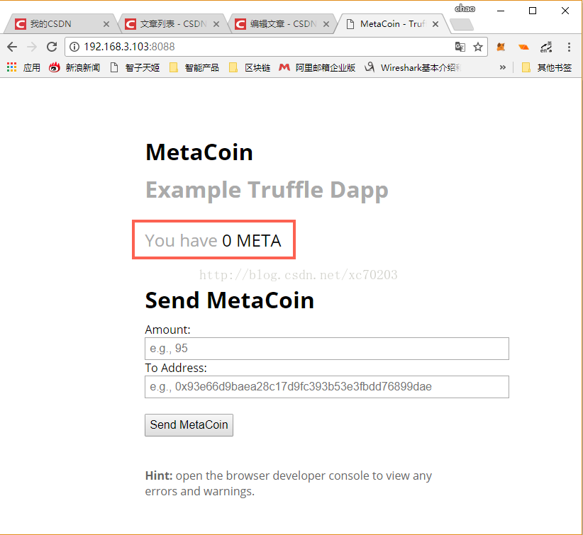 (2) 验证局域网其他机器的访问:在IP:192.168.3.36主机上访问http://192.168.3.103:8088,发现并没有出现像tru-host本机访问时出现的10000个MetaCoin币。
