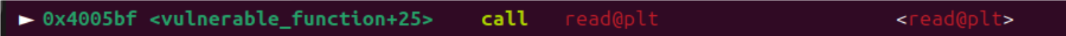 下一个断点,我就下在了main(b main);'r'运行;步过(‘n’)到功能函数(vulnerable_function);然后步入(‘s’);直到read函数,再‘n’;‘n’之后随便输入几个a;