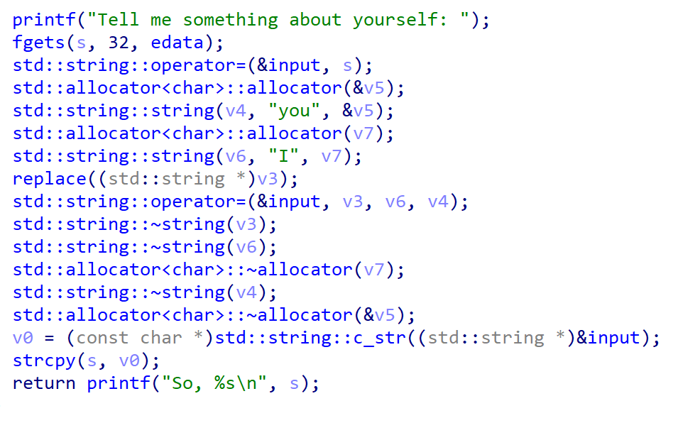 这64个字符如何构成呢,分析vuln()函数中间那一段C++,可知,输入I(1个字符)会返回you(3个字符),则可以构造payload = b'I'*21 + b'a'*1