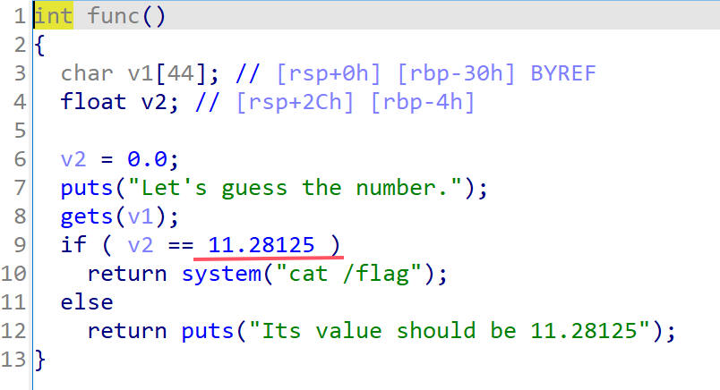 此题打开之后,gets泄露,于是用了老办法,垃圾数据用cyclic填了56个(0x30+8),在之后就执行v2 == 11.28125,发现并不行。