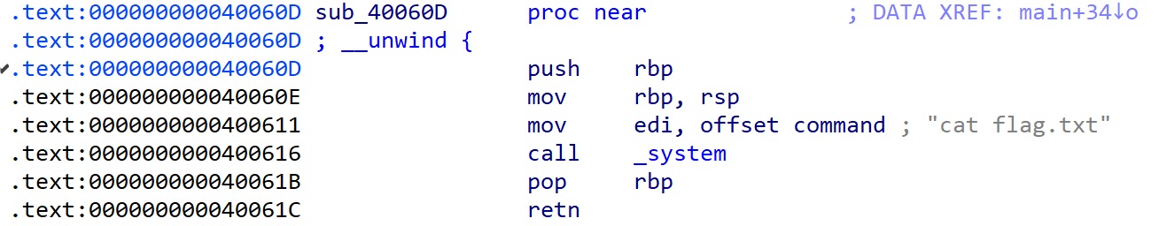 栈溢出之后,直接执行system("cat flag.txt")。打远程能得flag