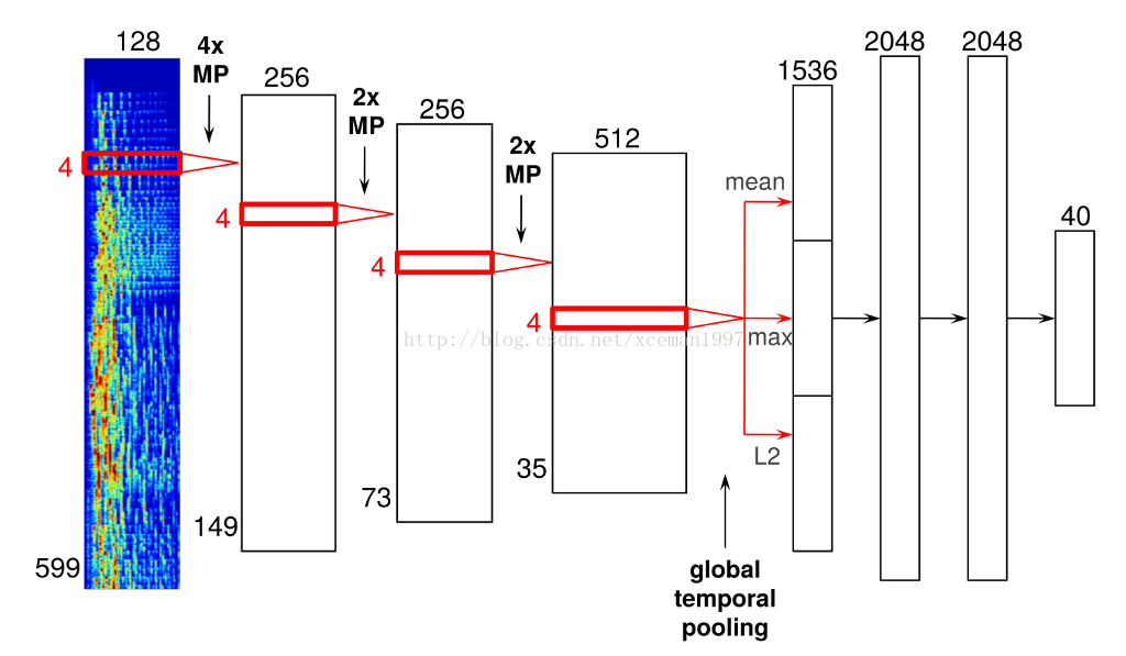 最左端是音频输入层,然后是连个卷及网络,然后是几个全连接的正常神经网络。作者并没有解释为什么是这样的网络结构。最后一层40个节点,输出是vector_exp算法的结果,不是softmax,不过从名字上看貌似他俩都差不多,可能一个实现性函数,另一个是非线性的函数。